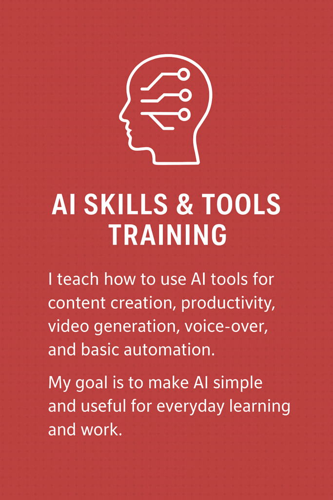 I teach how to use AI tools for content creation, productivity, video generation, voice-over, and basic automation. My goal is to make AI simple and useful for everyday learning and work.
